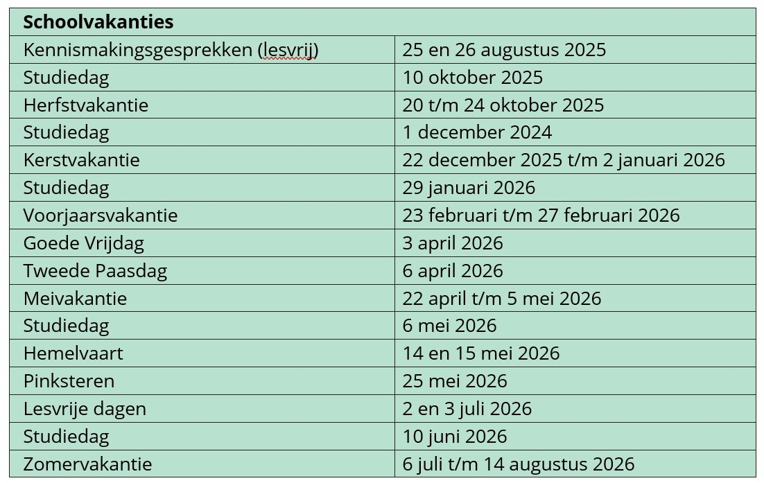 Scholen zijn vrij om zelf te bepalen hoe zij deze uren verdelen over het jaar. Onderstaande tabel geeft een overzicht van het aantal klokuren in dit schooljaar.